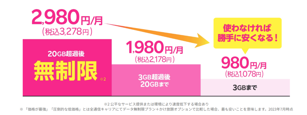 3GBまでは1,078円、20GBまでは2,178円、20GB超過後は3,278円となります。