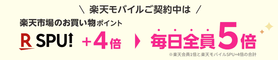 また、楽天市場でのお買い物が5倍おトク(楽天会員1倍と楽天モバイルSPU+4倍)になる特典もあります。この特典を利用すれば楽天モバイルを無料で利用することも可能に!