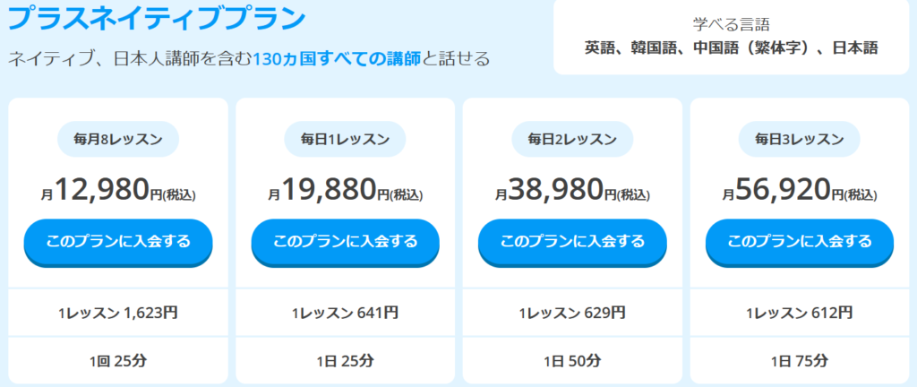 - プラスネイティブプラン: 月額12,980円で、毎月8レッスンを受けることができます